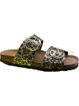 Spécialité de ce modèle : Mule à double bride réglable avec boucles dorées stylisées, montée sur semelle liège avec coussinet de confort