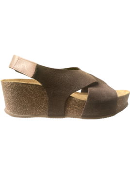 Spécialité de ce modèle : Sandale à semelle liège avec première en cuir matelassé montée sur coussinet de confort, dotée d'un croisé élégant à l'avant et d'une bride arrière réglable par scratch